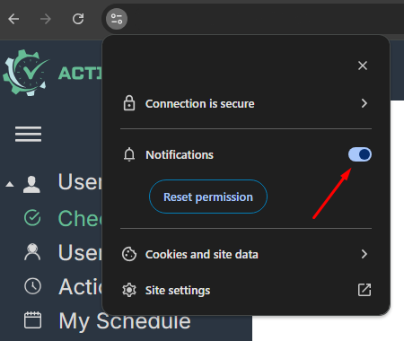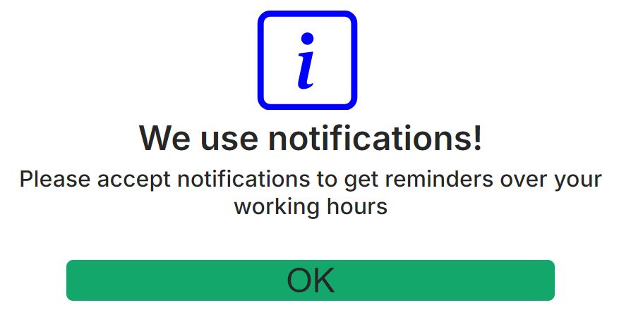 To improve the user experience of the Action Tracker system, our team has added a notification feature that will be displayed on your PC when you need to perform a Check IN/Check OUT or Pause Stop. Upon logging into the system, you will be prompted to enable this functionality: