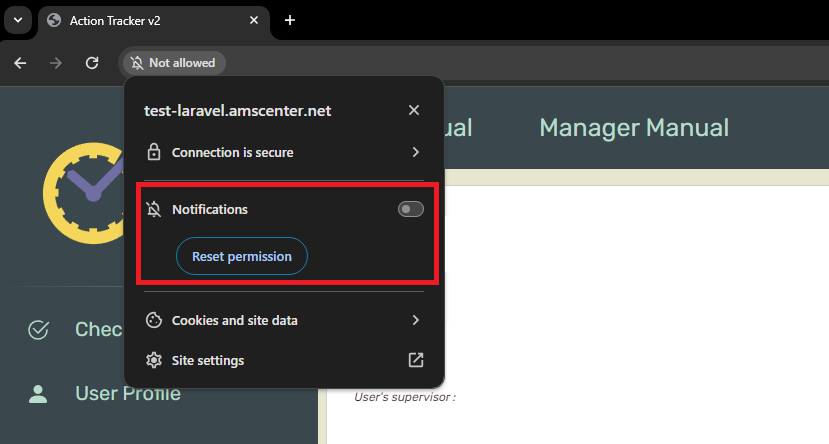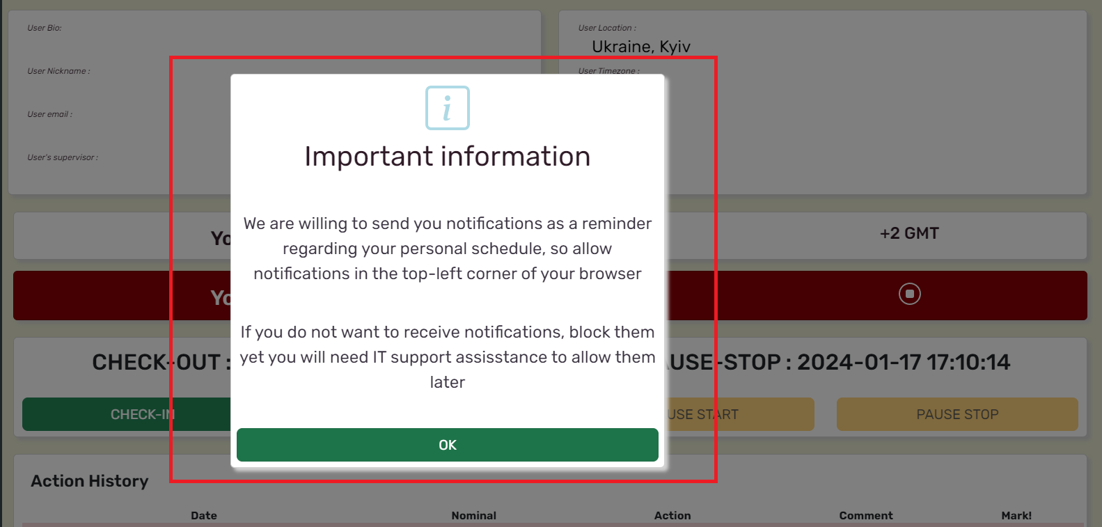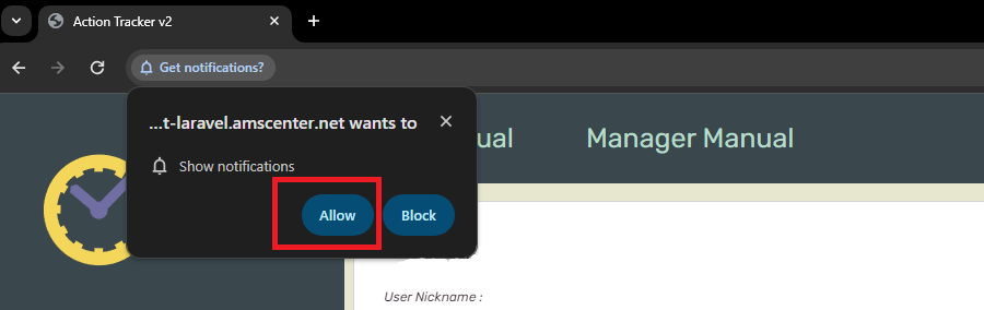 To improve the user experience of the Action Tracker system, our team has added a notification feature that will be displayed on your PC when you need to perform a Check ININ/Check OUT or CheckPause OUT.End. Upon logging into the system, you will be prompted to enable this functionality: